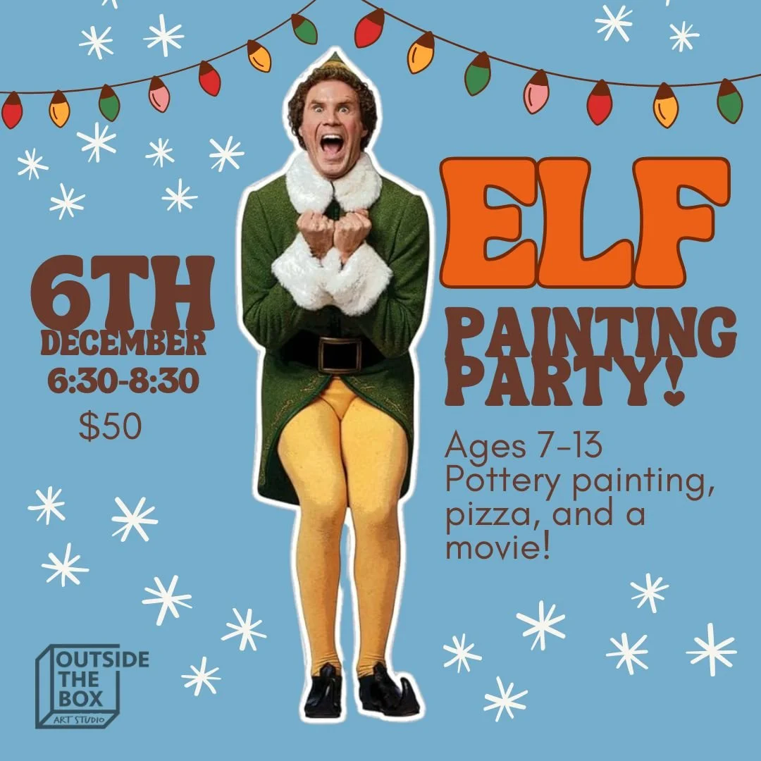 Drop the kids off as we have a ELF inspired night! We will be glazing our very own Elf inspired pottery, watching the Christmas Elf movie and snacking on some pizza, chips and fruit (or maybe even syrup covered spaghetti!) Drop the kiddos off and go enjoy your evening as we have some fun in the studio!